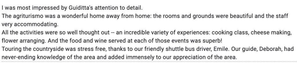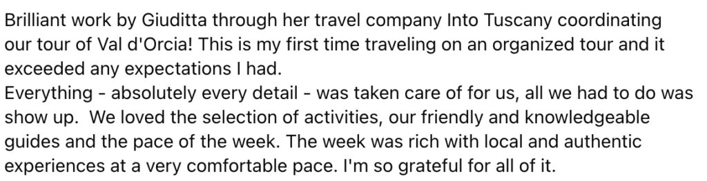 Giuditta is a perfect guide, an organizer par excellence. Her local knowledge of the region, its hidden and other secrets as well as her connections with the community all served to make our trip to Greve unforgettable.